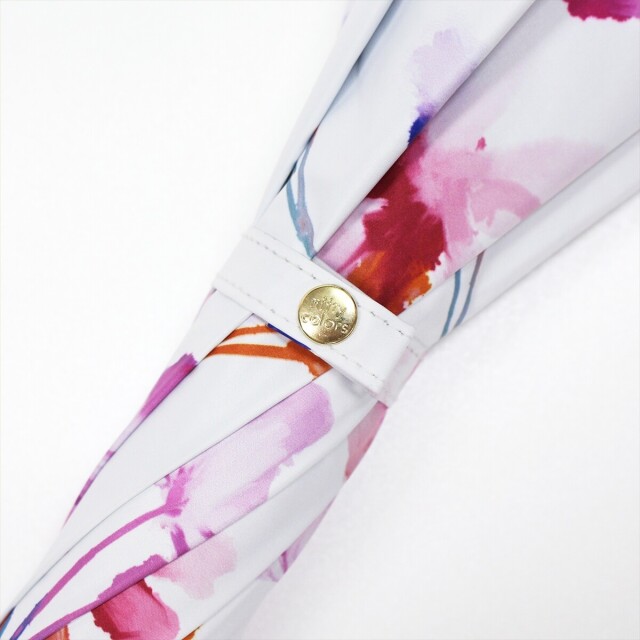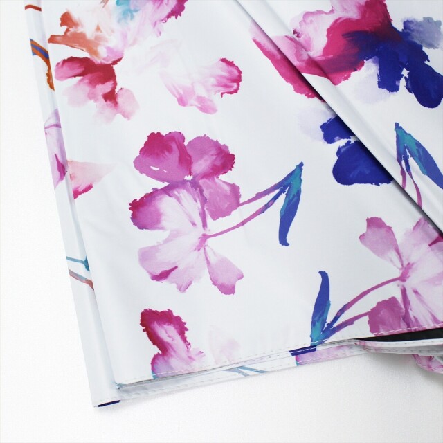 ピンクを基調としたカラーで一面に花を散らしたビビットなデザインです。使用するだけで華やかさを演出してくれます。裏側のポリウレタン加工の色はブラックになっていて、表の柄を引き立てつつ、ダークな色は光を吸収し日陰を作る効果があり、強い日差しに最適です。
