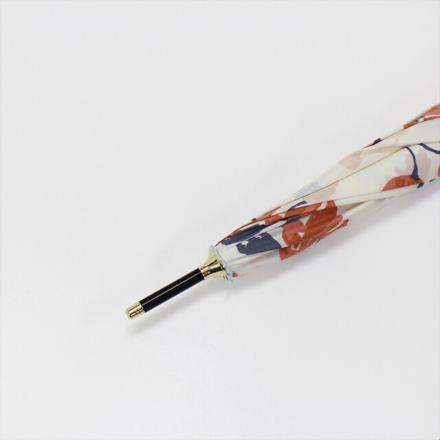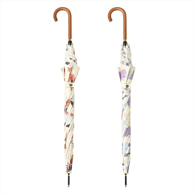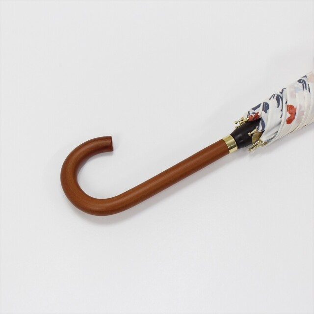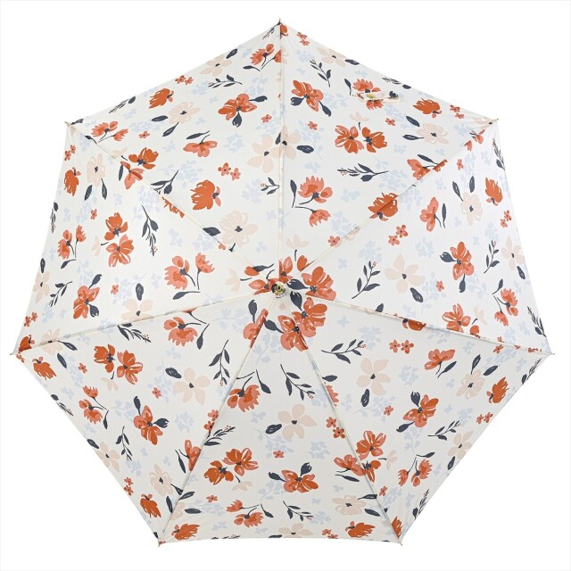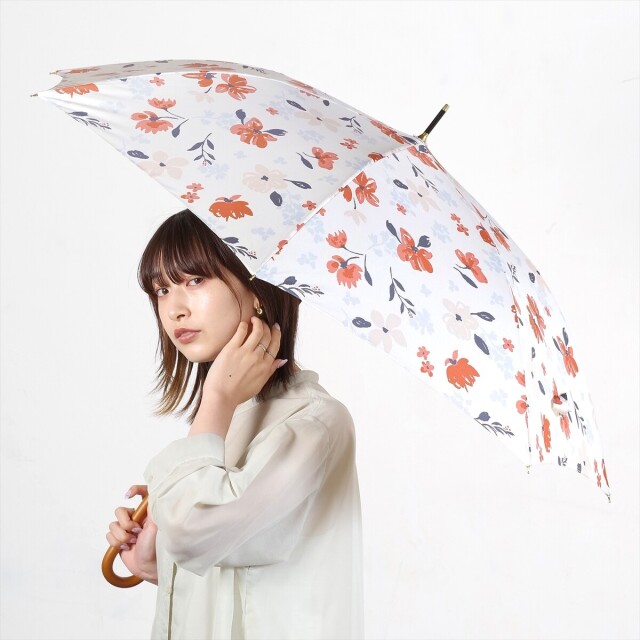 白地に散りばめられた手描き風な花が、すっきりした華やかさを感じさせます。赤系とラベンダー系の花がポイントになっているので、開いた時も閉じた時もコーディネートのアクセントになります。